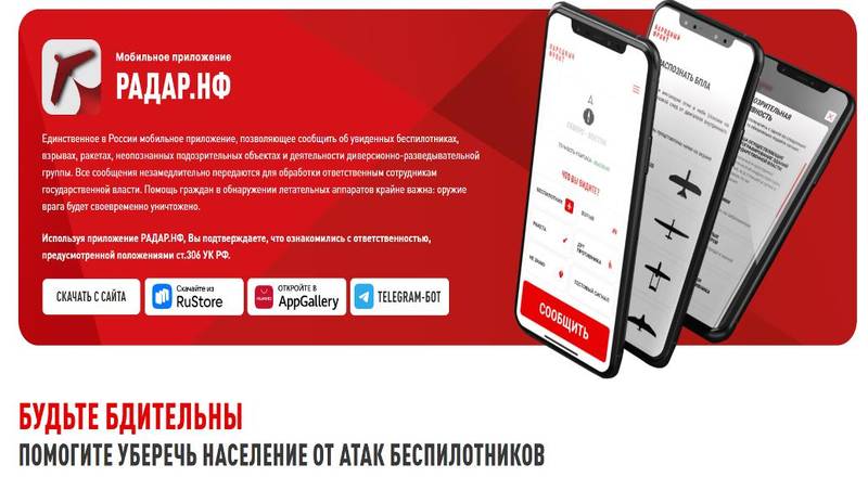 Мобильное приложение "РАДАР.НФ" является единственным в России мобильным приложением, позволяющим сообщить об увиденных беспилотниках, взрывах, ракетах, неопознанных подозрительных объектах и деятельности диверсионно-разведывательных групп.